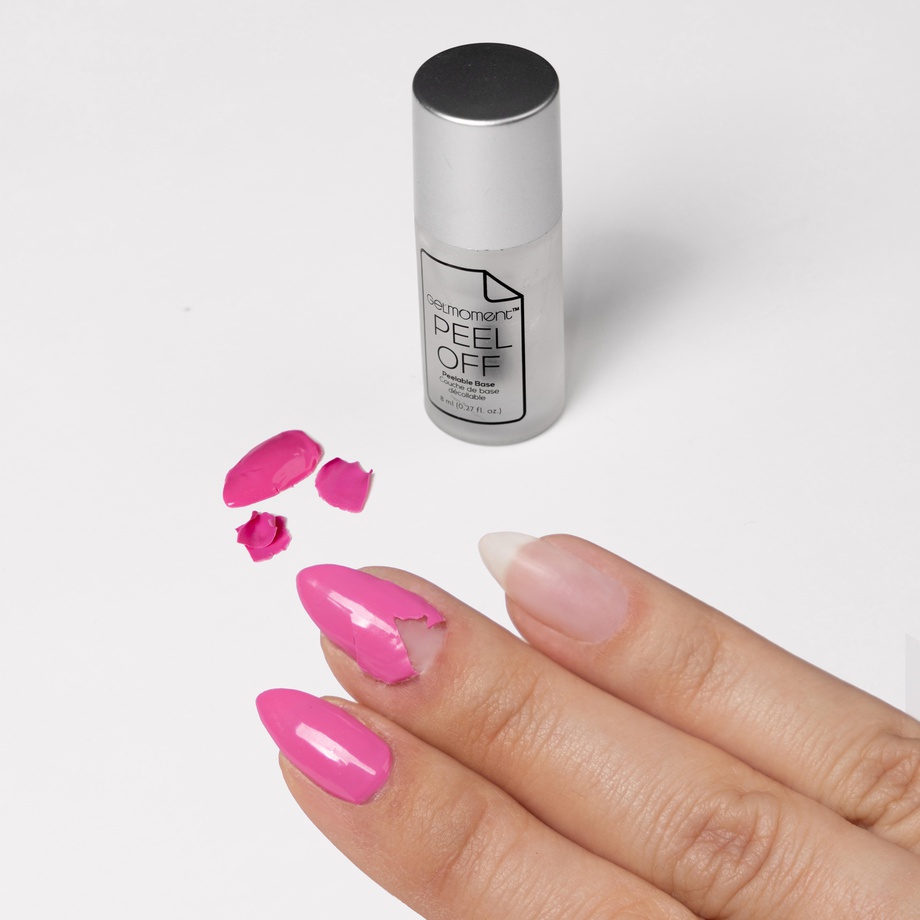 • Gently peel off when it’s fully dry, with a GelMoment Cuticle Pusher by gently  lifting the polish from just above the cuticle.